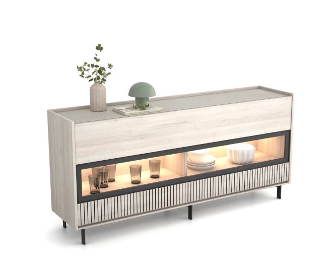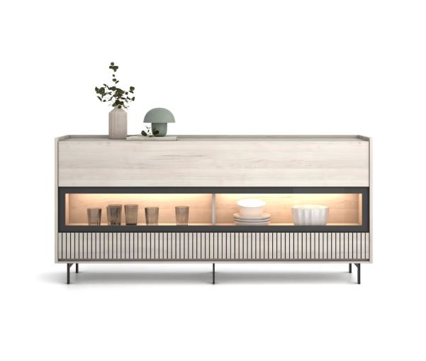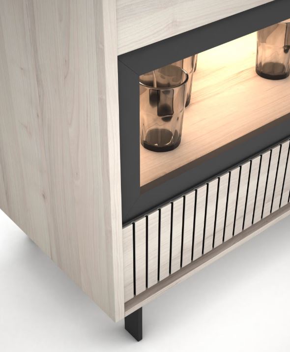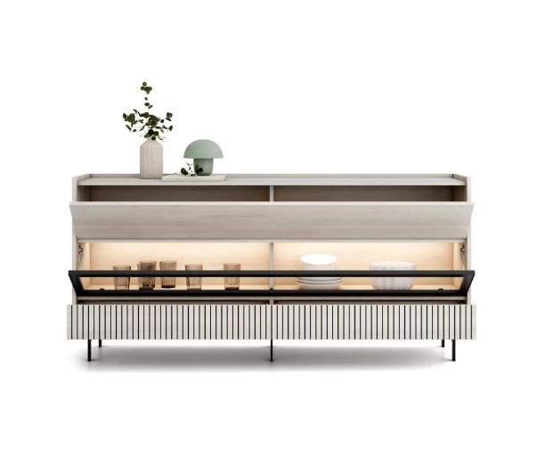 Aparador puerta abatible madera, puerta abatible aluminio y cajón.